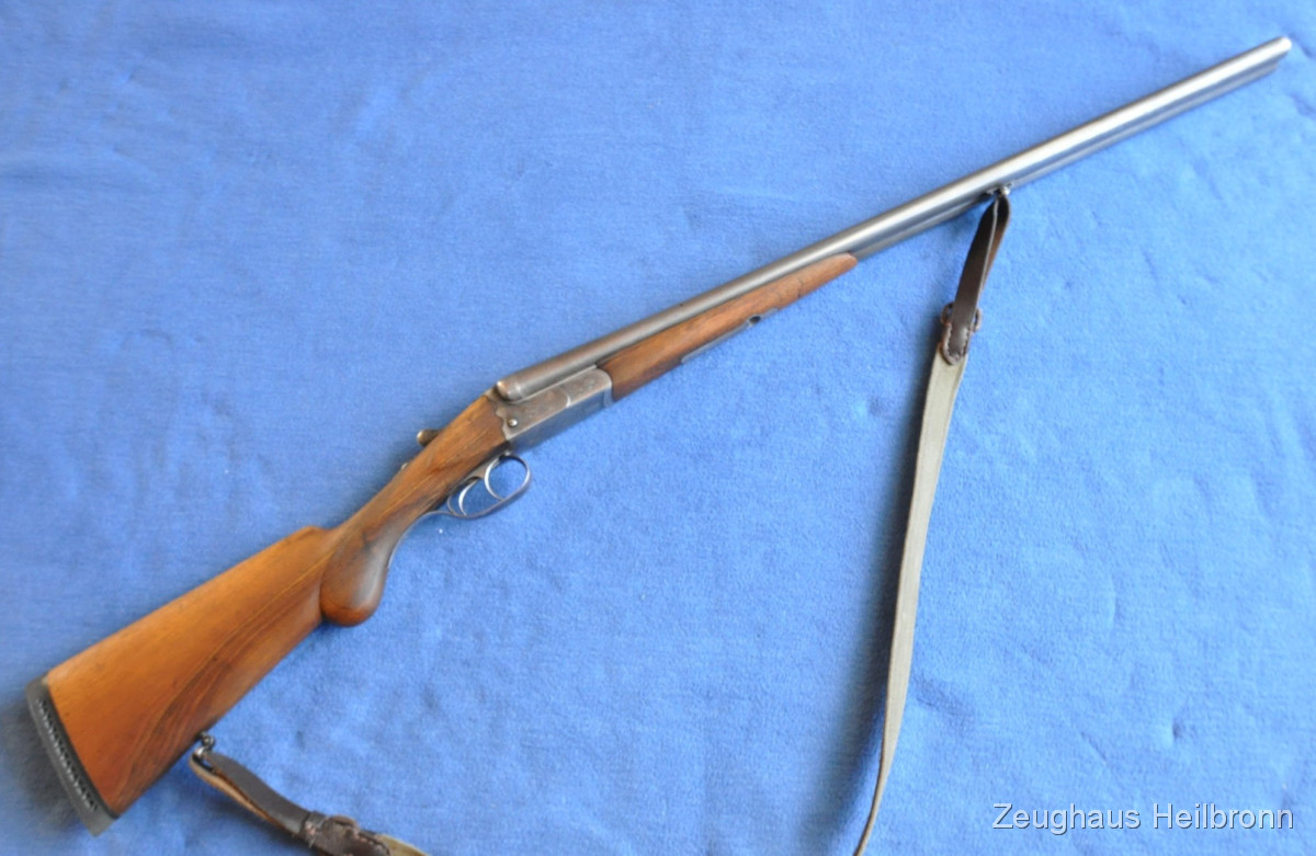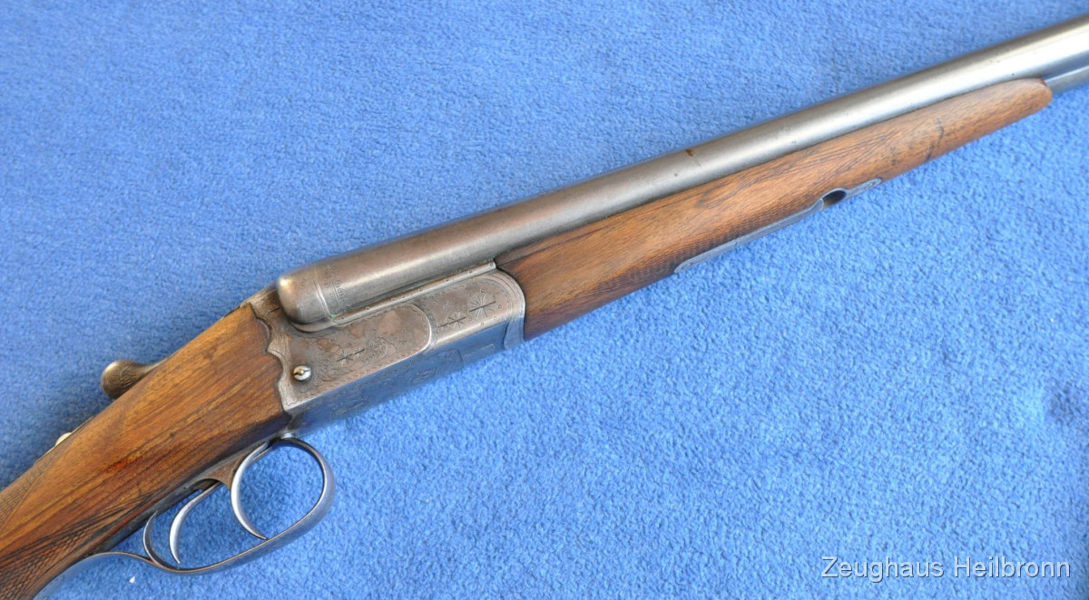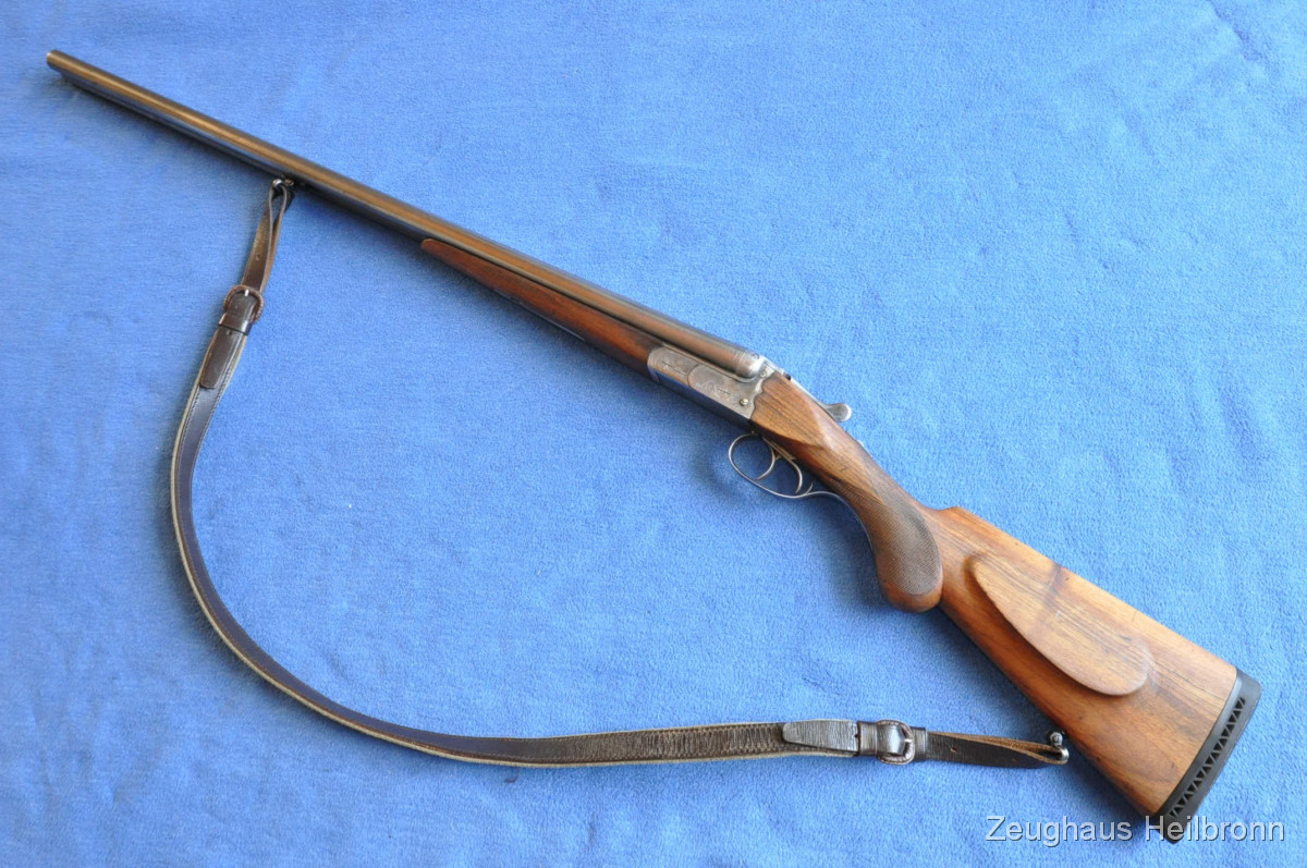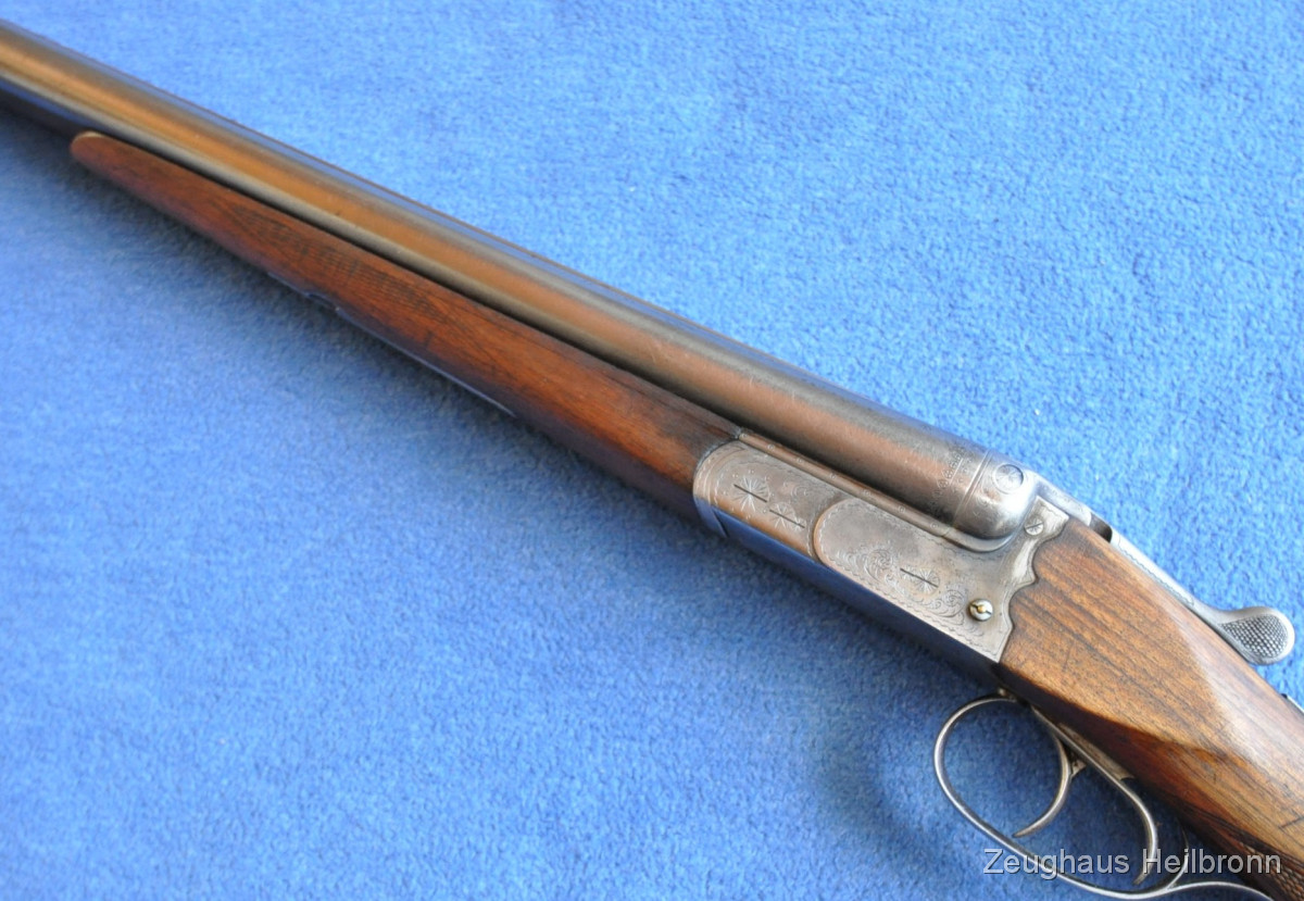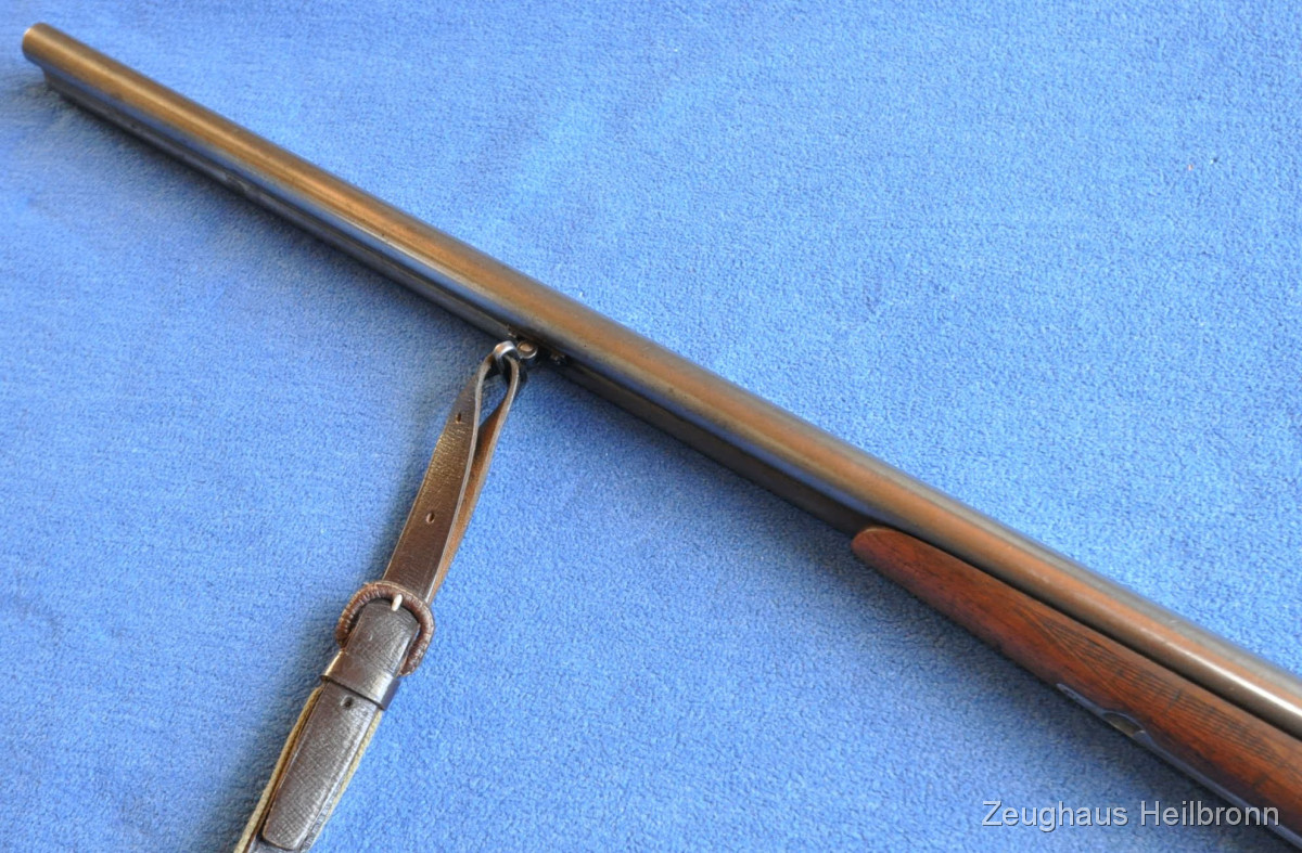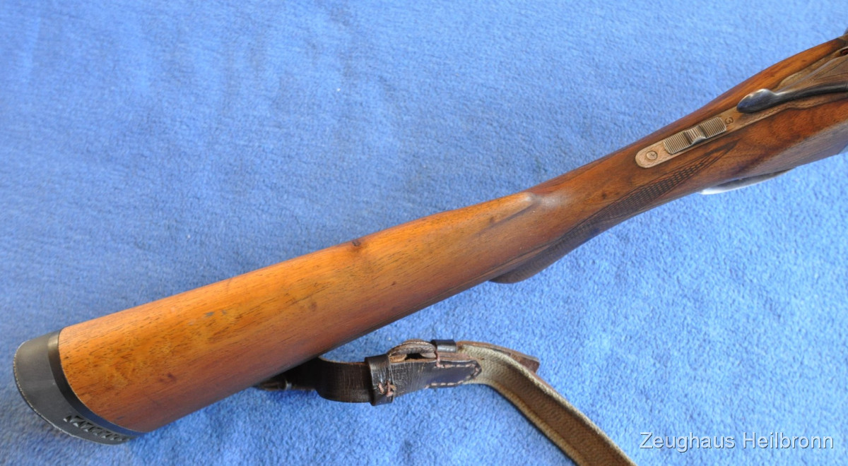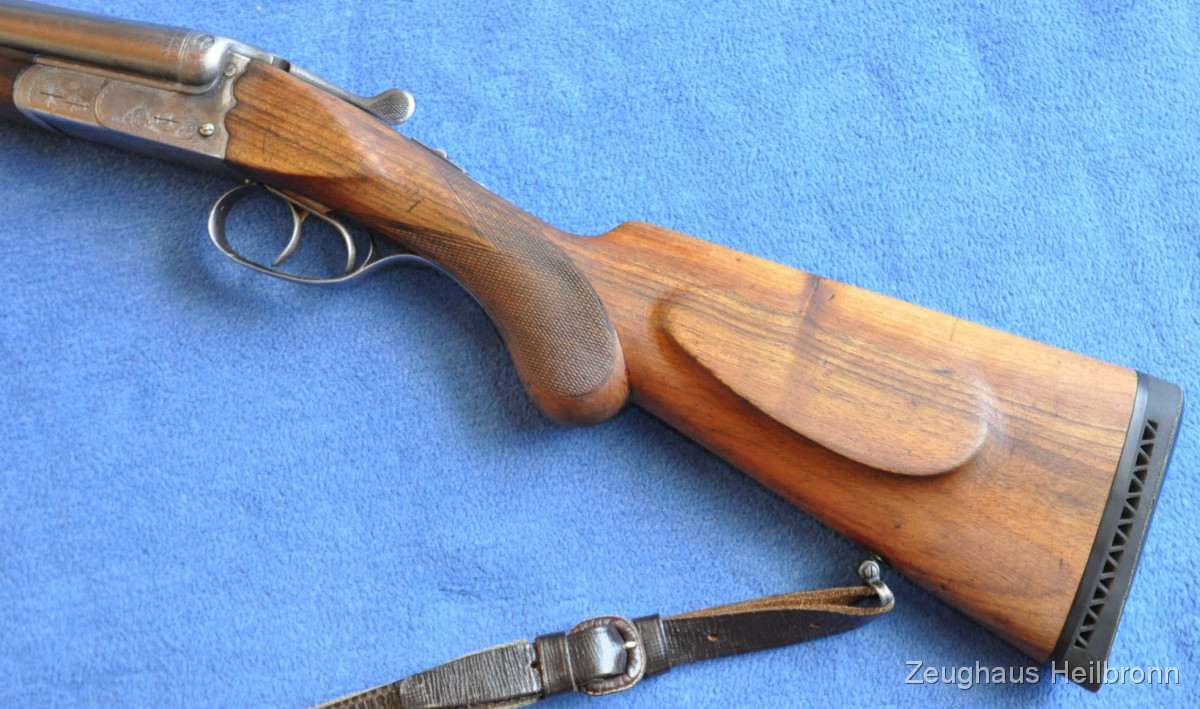 Waffe in einem gebrauchten Zustand, System dicht, Läufe blank. Systemkasten mit Gravur, Signalstifte.