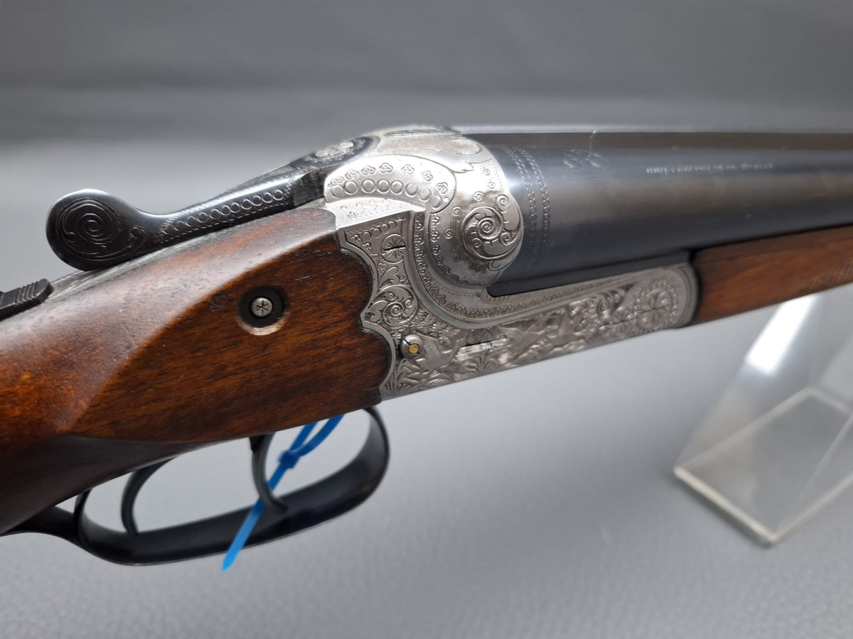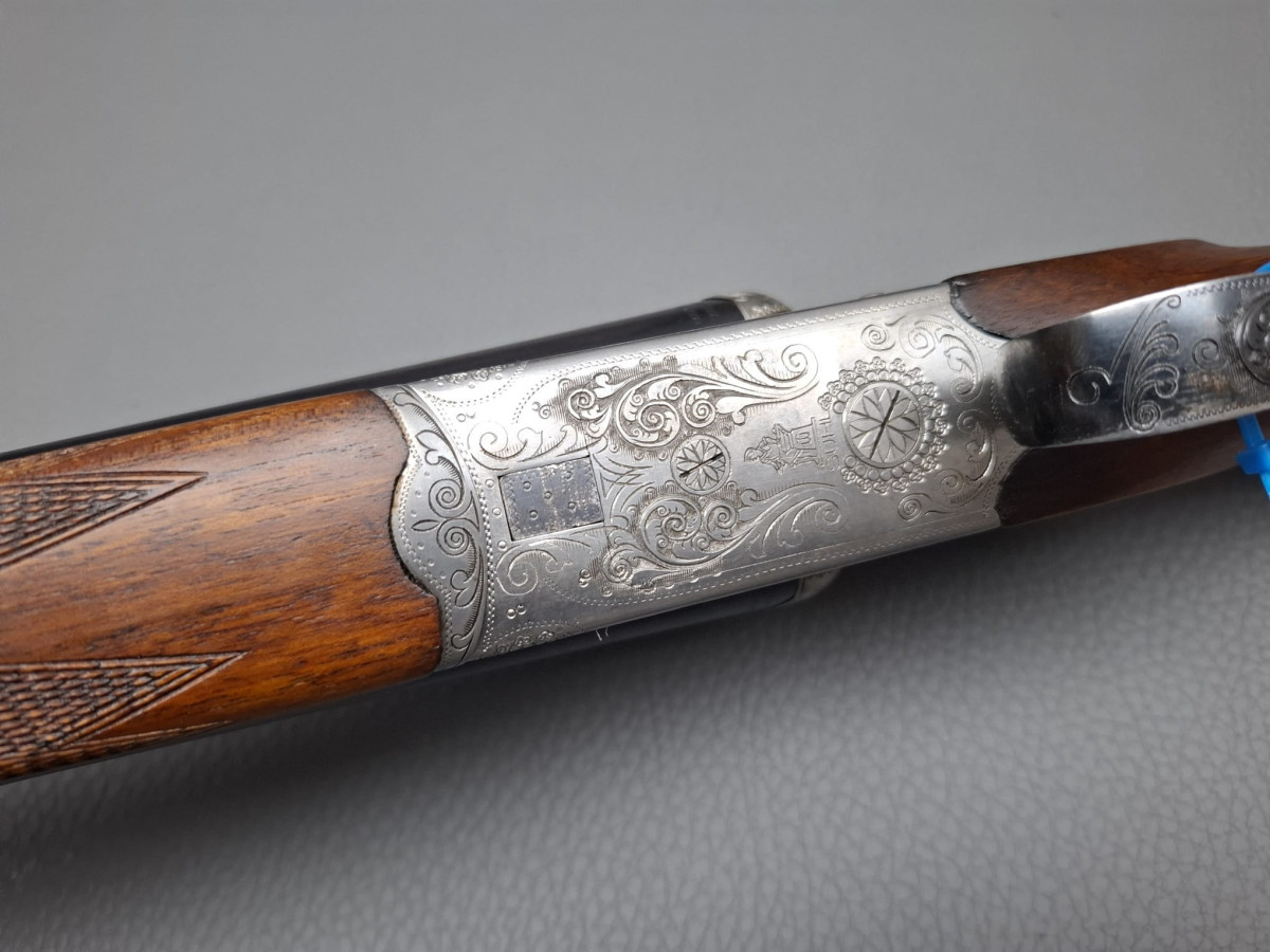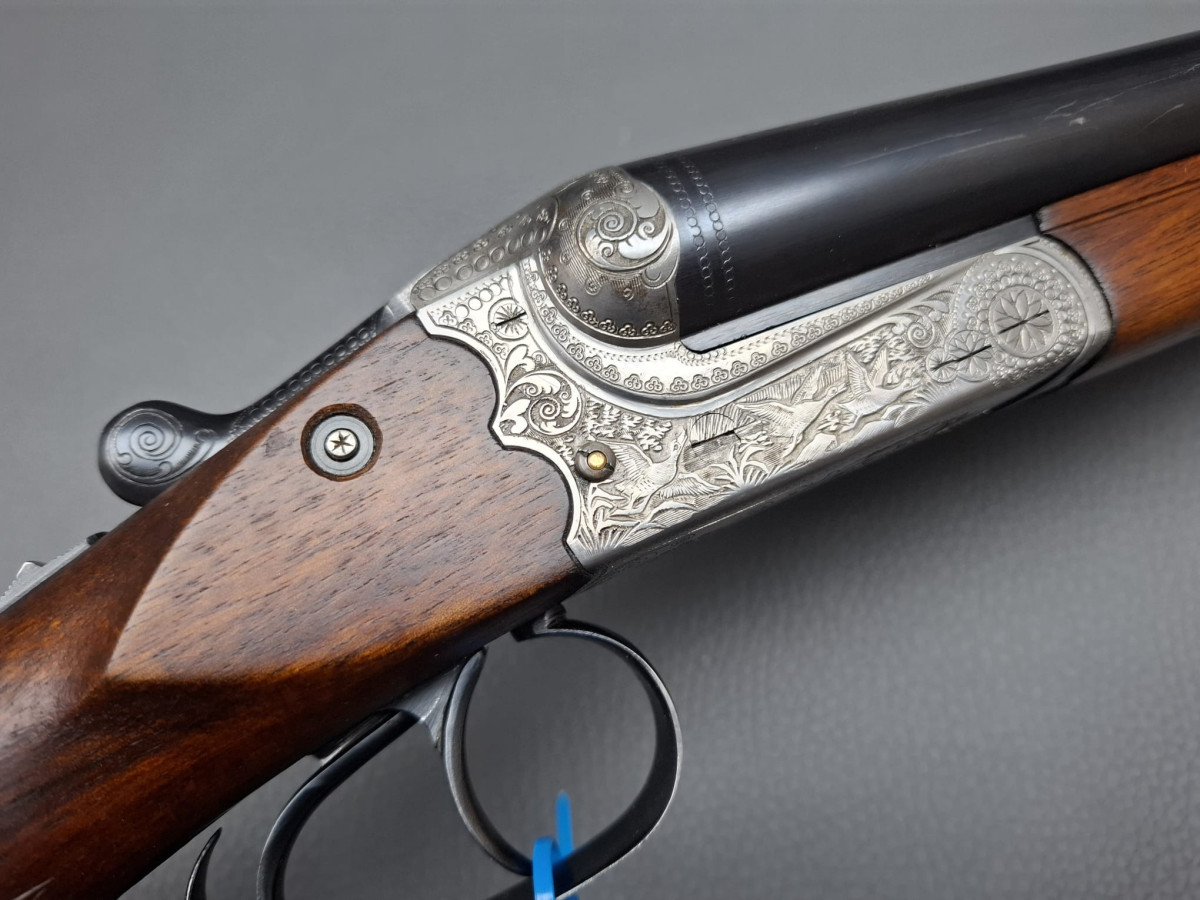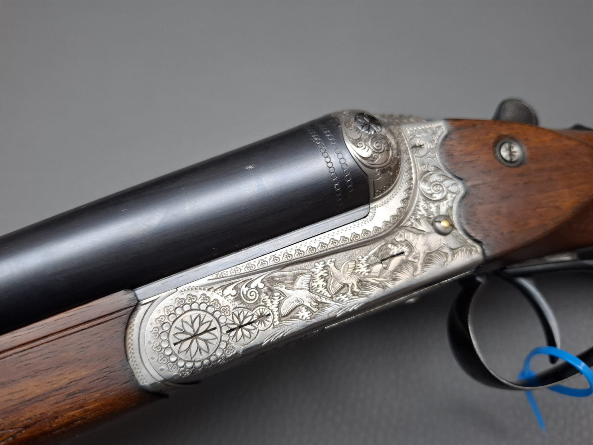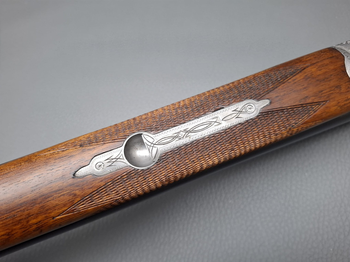 bewährte Suhler Qualität: Simson Querflinte Lauf mit Messingkorn, reichhaltig gravierte Basküle, Tierstücke und Arabesquen, Spannanzeiger