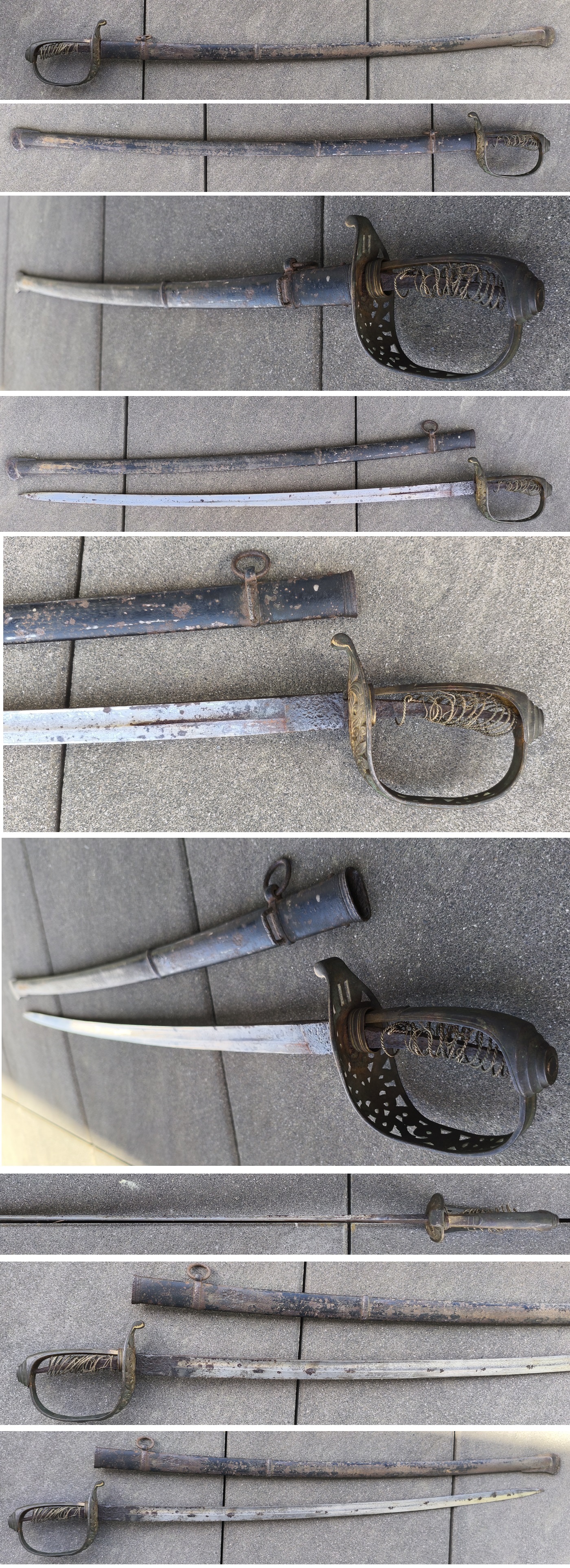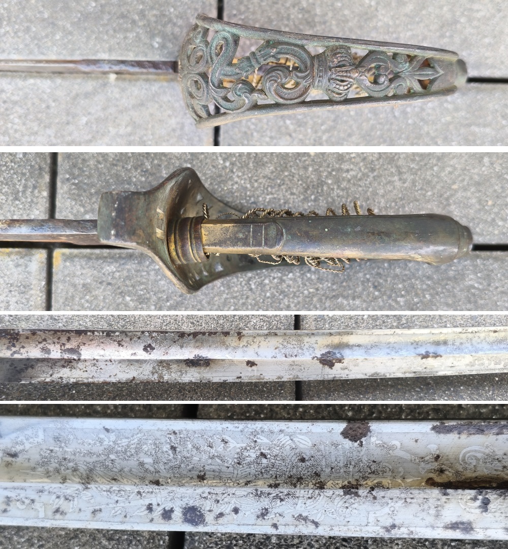 Leicht geschwungene geätzte Rückenklinge (Wappen usw), Fehlschärfe umlaufend rostnarbig, durchbrochenes Messinggefäß mit Wappen L unter Krone. Originale Vernietung. Griff fehlt. Geschwärzte rostige Scheide. Gesamtlänge 94,2cm mit Scheide.